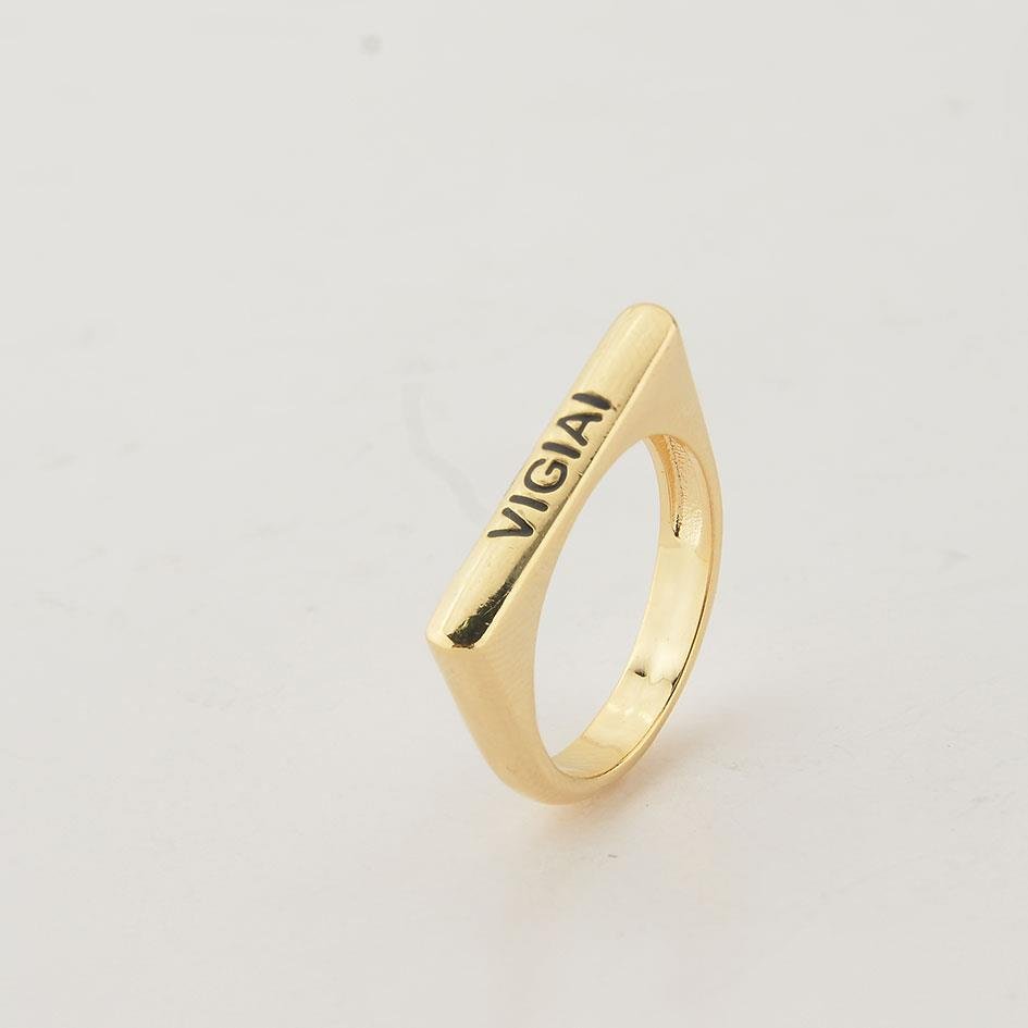 Anel de aro liso com detalhe em relevo escrito "VIGIAI" com aplique de resina preta, folheado a Ouro 18K.