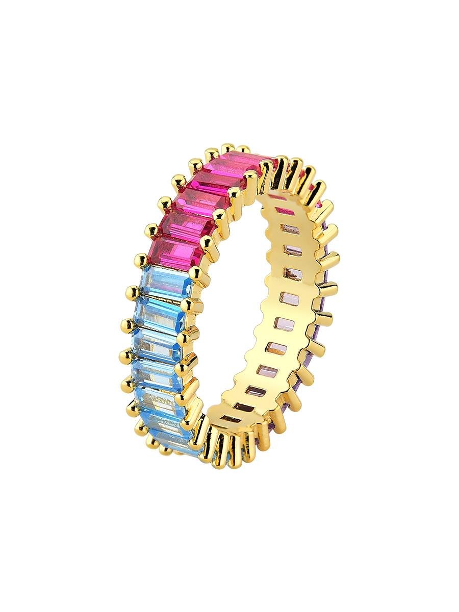 Anel cravejado com zircônias baguete colorida, banhado em ouro 18k.| Tamanhos | |||||