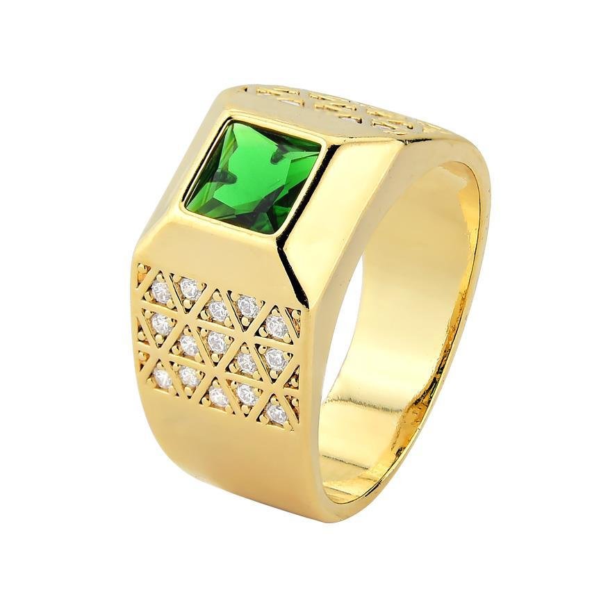 - Anel masculino com aro largo com detalhes cravejados em micro zircônia incolor e cristal turmalina.- Banho de ouro 18K.