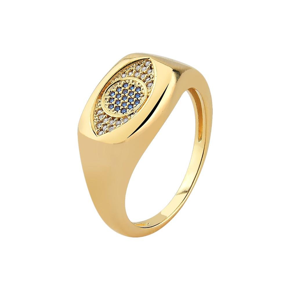 - Anel com detalhe cravejado em formato de olho grego.- Banho de ouro 18K.