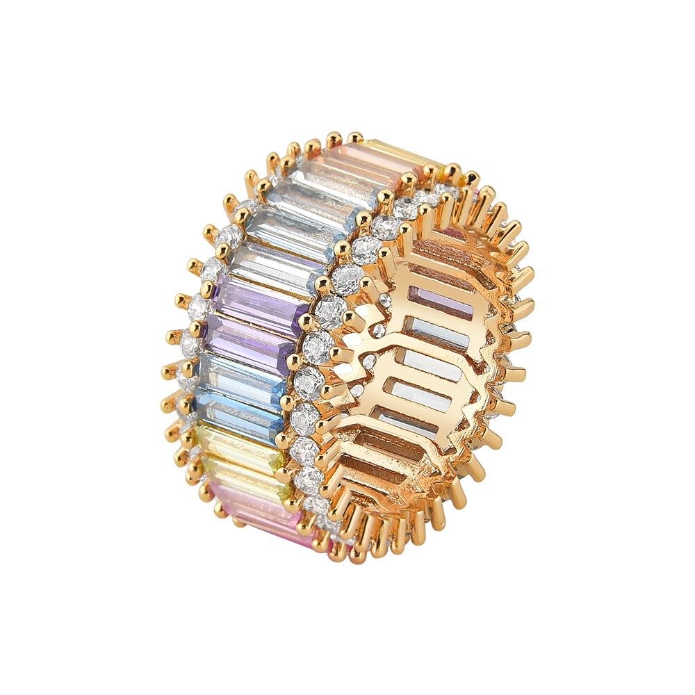 Anel com aro composto por zircônias baguete coloridas e detalhes em micro zircônia incolor, Banho de ouro 14K.