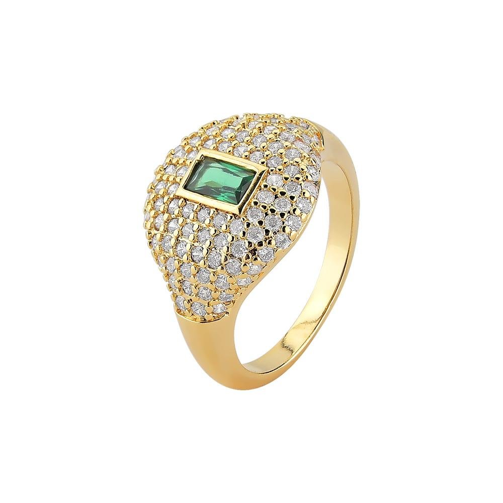 - Anel cravejado com microzircônias incolor e detalhe em zircônia esmeralda.- Banho de ouro 18K.