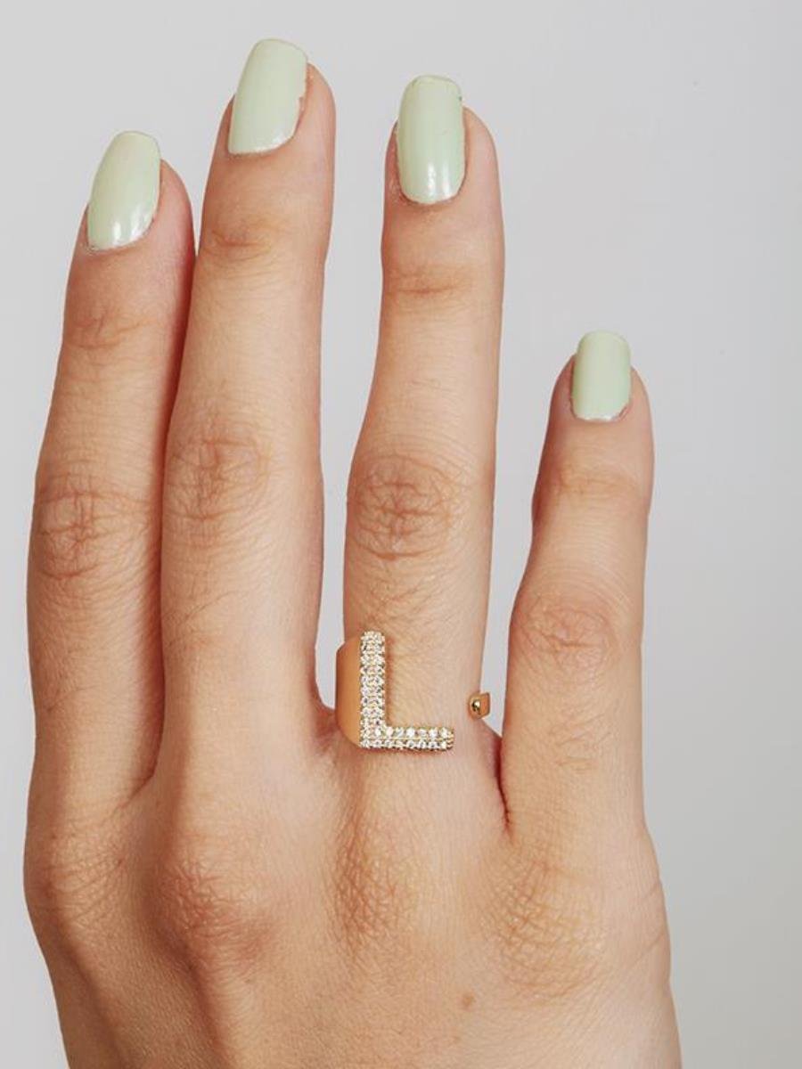 -Anel com aro em formato da letra L e acabamento cravejado com micro zircônia incolor.