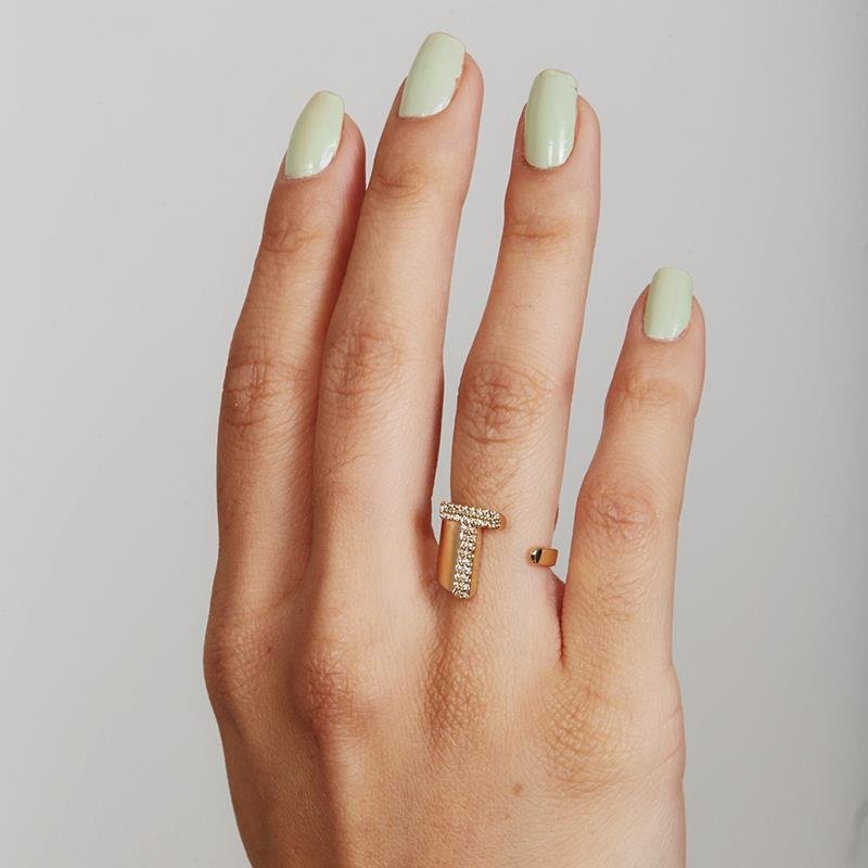 -Anel com aro em formato da letra T e acabamento cravejado com micro zircônia incolor.