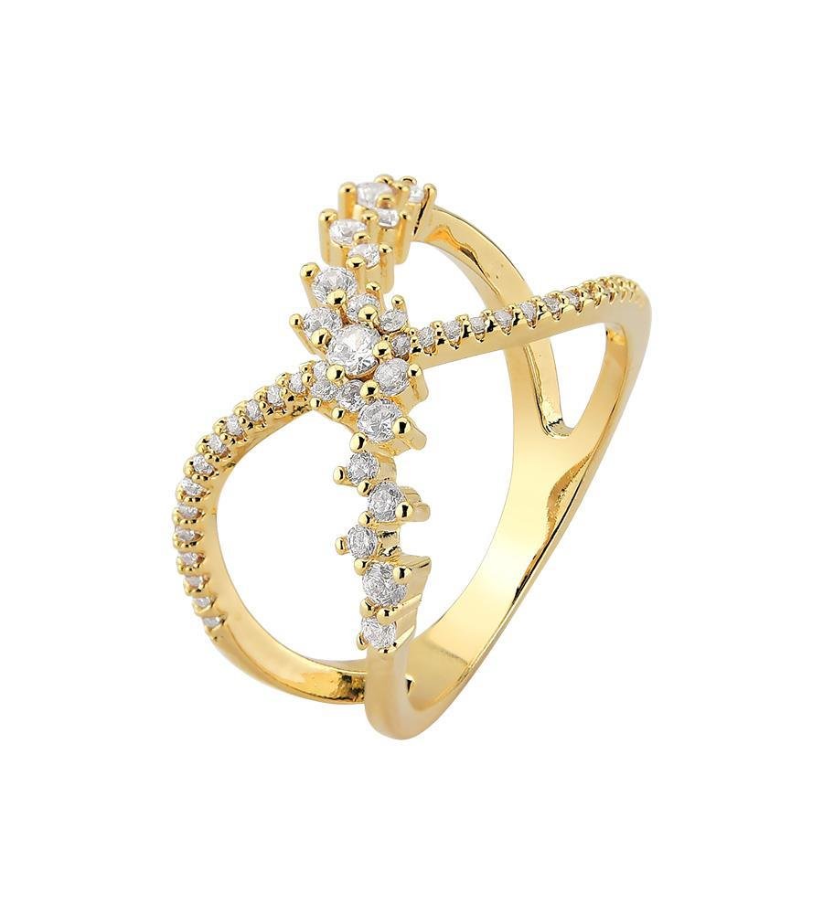 - Anel dourado de aro vazado com detalhe transpassado cravejado em mcro zircônia incolor.- Banho de ouro 18K.