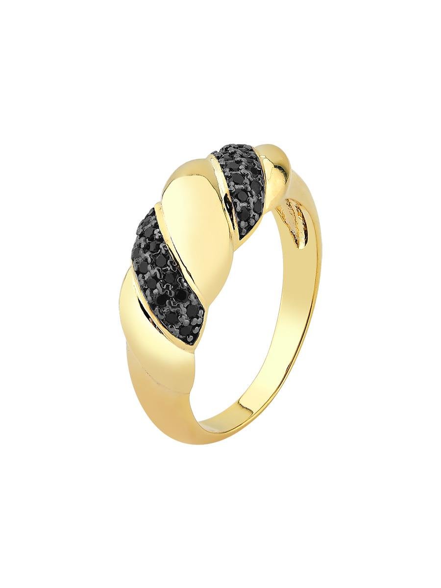 - Anel com designer torcido no formato de croissant com detalhes de zircônias negra e aplique de ródio negro.- Banho de ouro 18k.