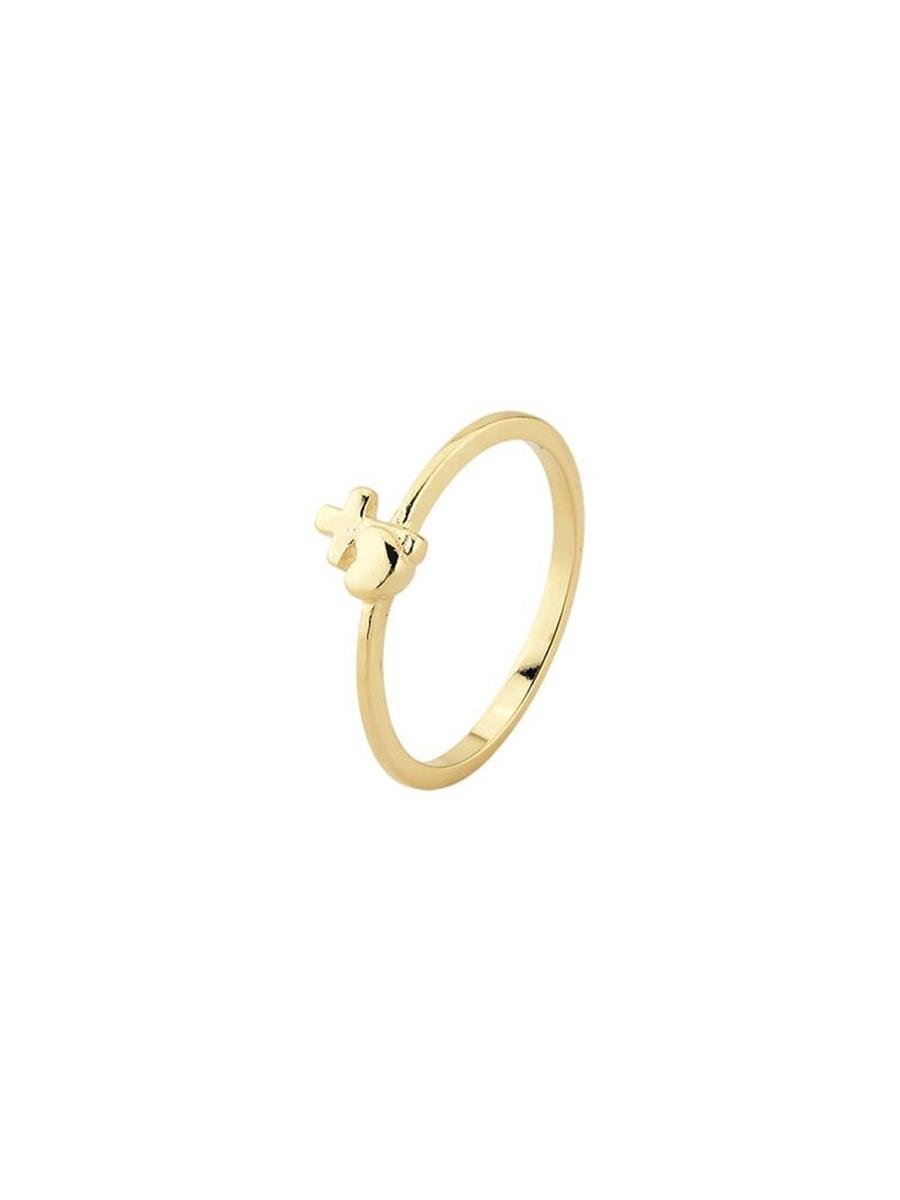 Anel com aro fino e liso com detalhe em formato de cruz e coração, banho de ouro 18K.