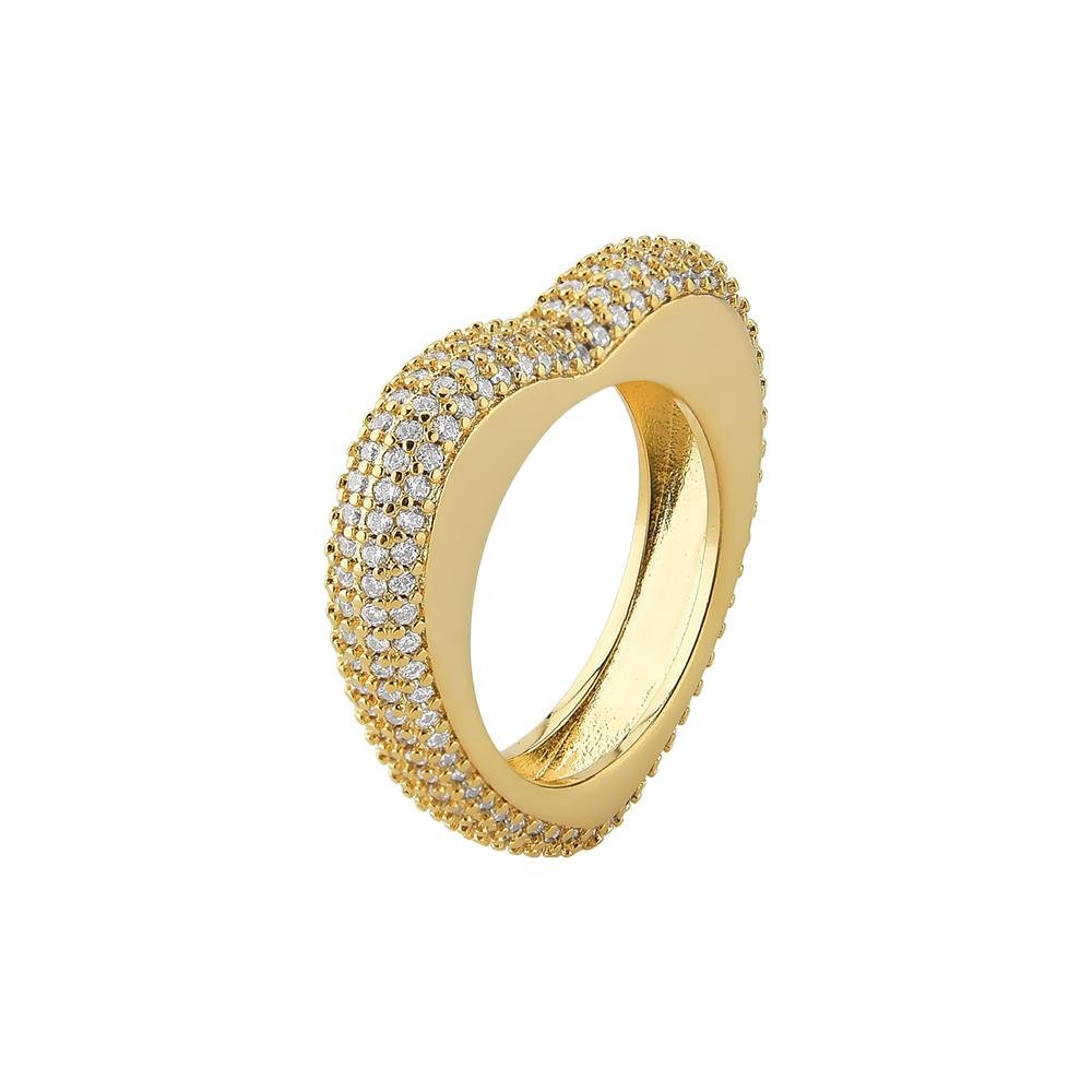 Anel com aro em formato coração cravejado com micro zircônias incolores, banho de ouro 18K.