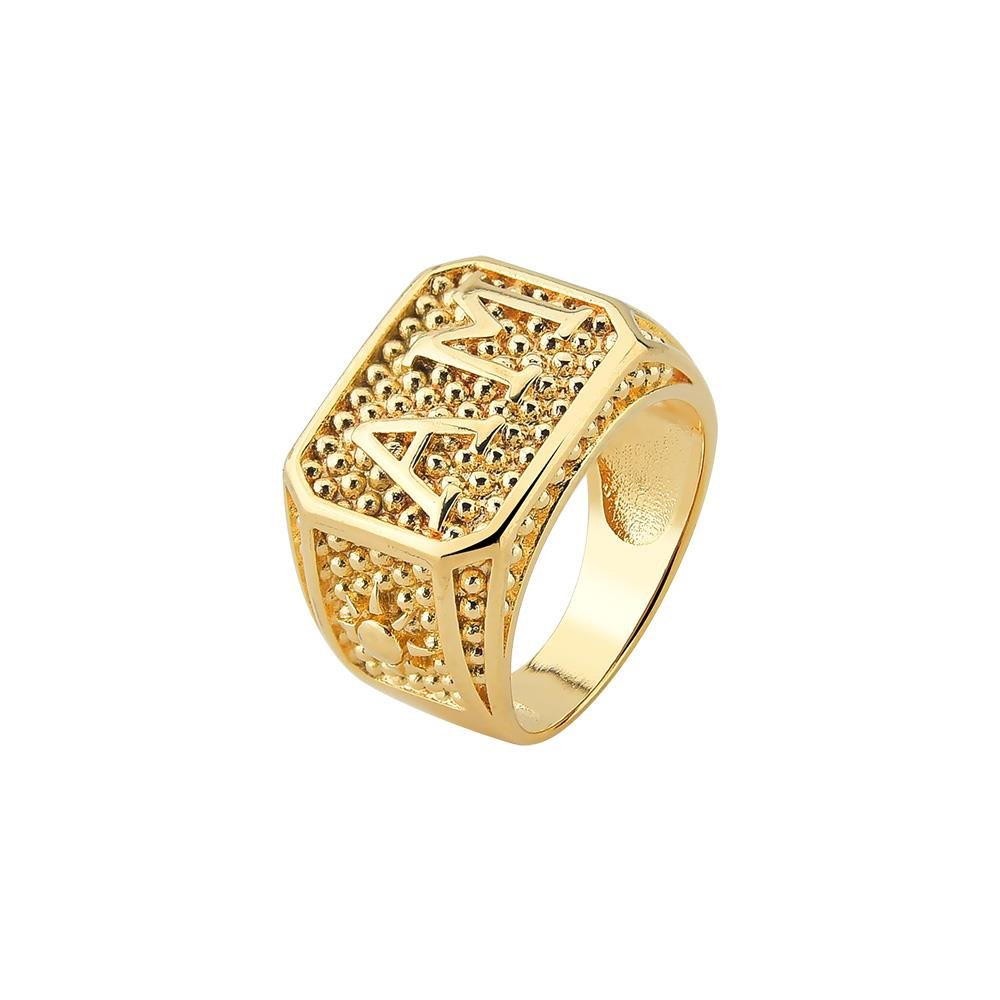 Anel com aro quadrado com a sigla "AM", com detalhes de bolinhas, ideal para usar no dedo mínimo, banho de ouro 18K.