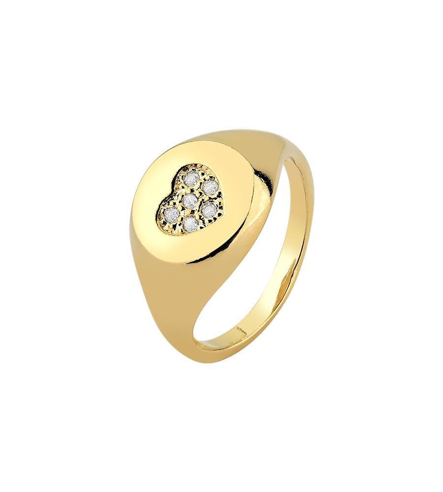 - Anel de aro liso com base achatada com coração cravejado em micro zircônia incolor.- Banho de ouro 18K.