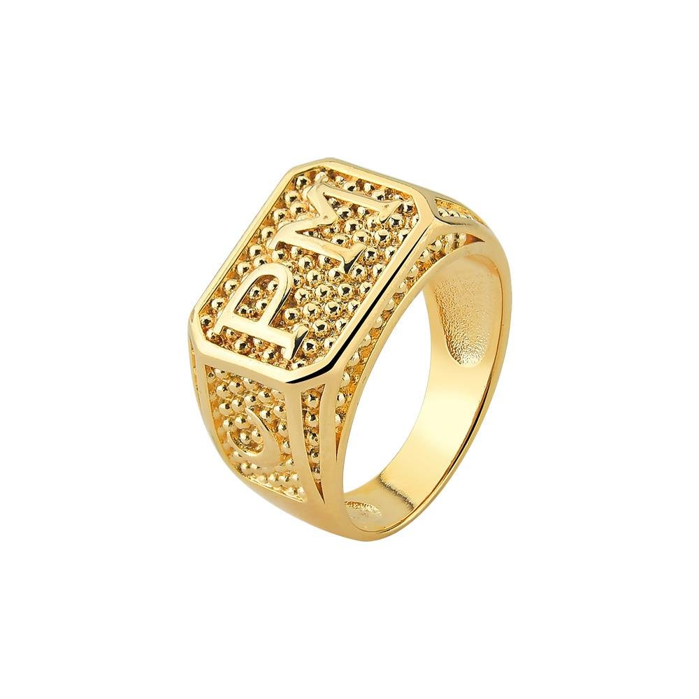 Anel com aro quadrado com a sigla "PM", com detalhes de bolinhas, ideal para usar no dedo mínimo, banho de ouro 18K.