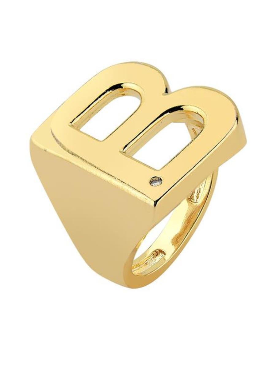 - Anel regulável com aro em formato da letra "B" e detalhe de zircônia incolor.- Banho de ouro 18K.