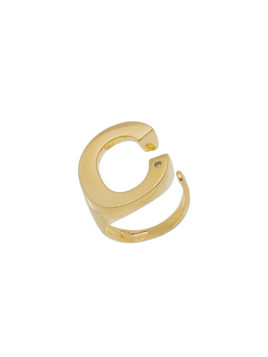 Anel regulável com aro em formato da letra "C" e detalhe de zircônia incolor, banhado a ouro 18K.