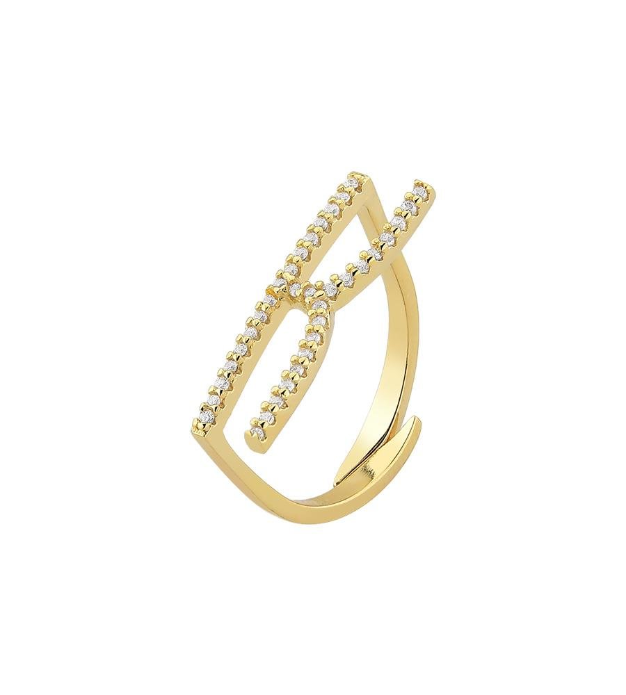 - Anel dourado de aro fino com letra K cravejada com micro zircônias incolor.- Banho de ouro 18K.