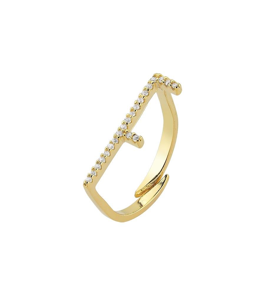 - Anel dourado de aro fino com letra F cravejada com micro zircônias incolor.- Banho de ouro 18K.