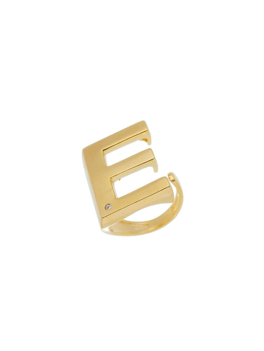 Anel regulável com aro em formato da letra "E" e detalhe de zircônia incolor, banhado a ouro 18K.