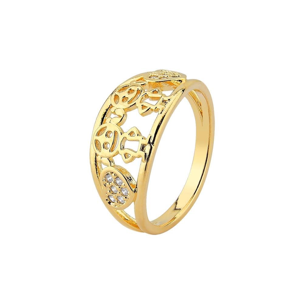 -Anel com aro vazado e detalhe em formato de duas meninas, com corações cravejados de zircônia incolor.