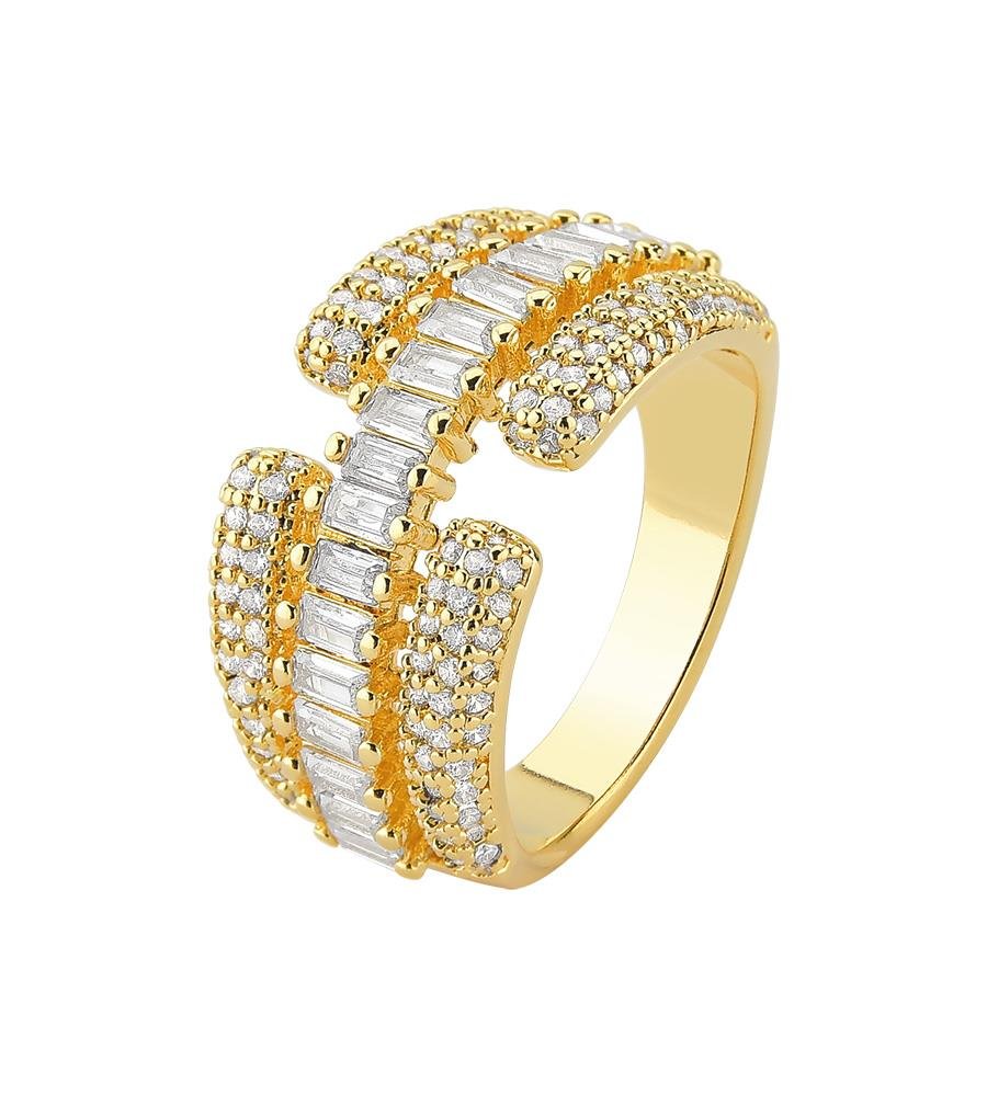 - Anel de aro largo cravejado com micro zircônias e zircônias baguete incolor.- Banho de ouro 18k.