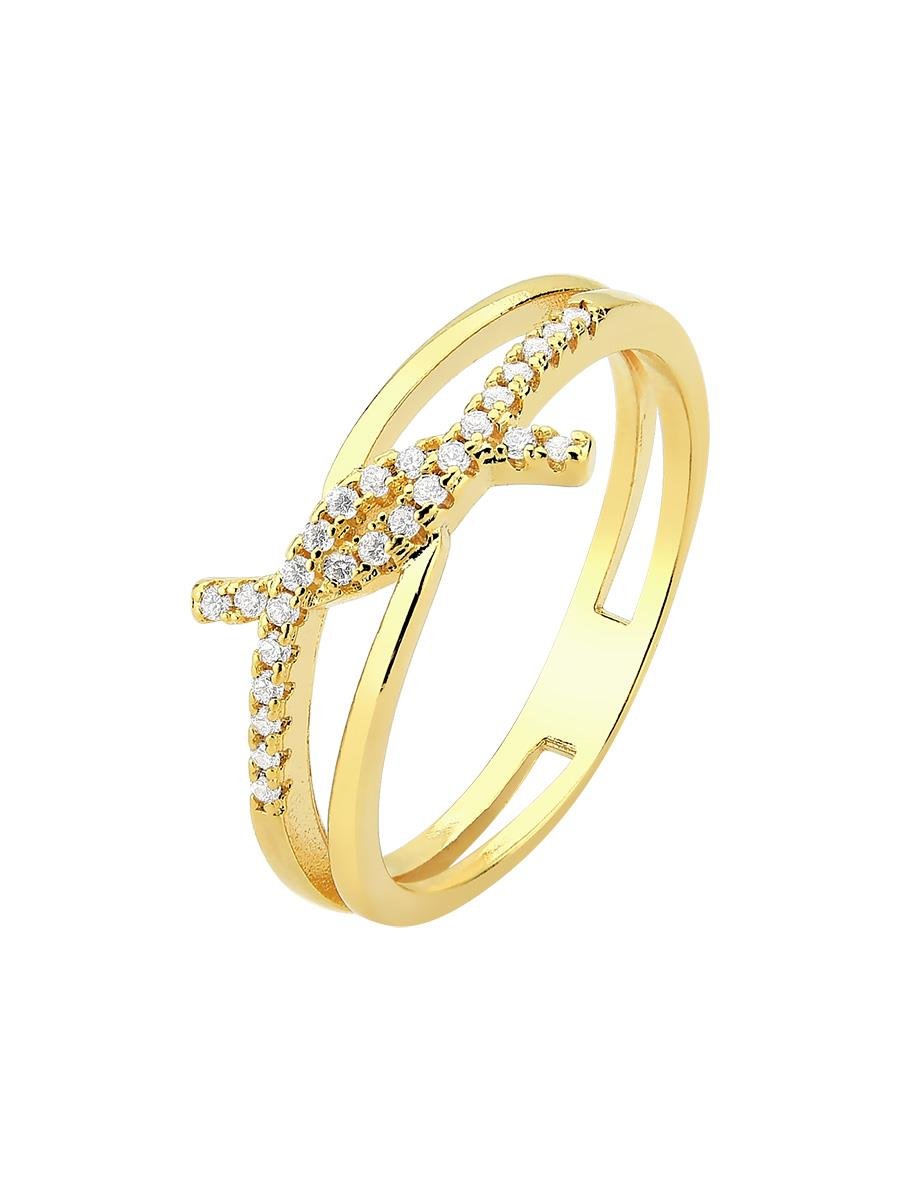 Anel em formato de nó cravejado com zircônais incolores, banho de ouro 18k.| Tamanhos | |||||