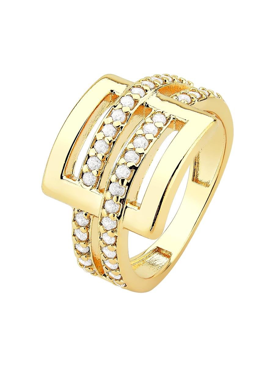 Anel quadrado cravejado com zircônias incolores, no banho de ouro 18k.| Tamanhos | |||||