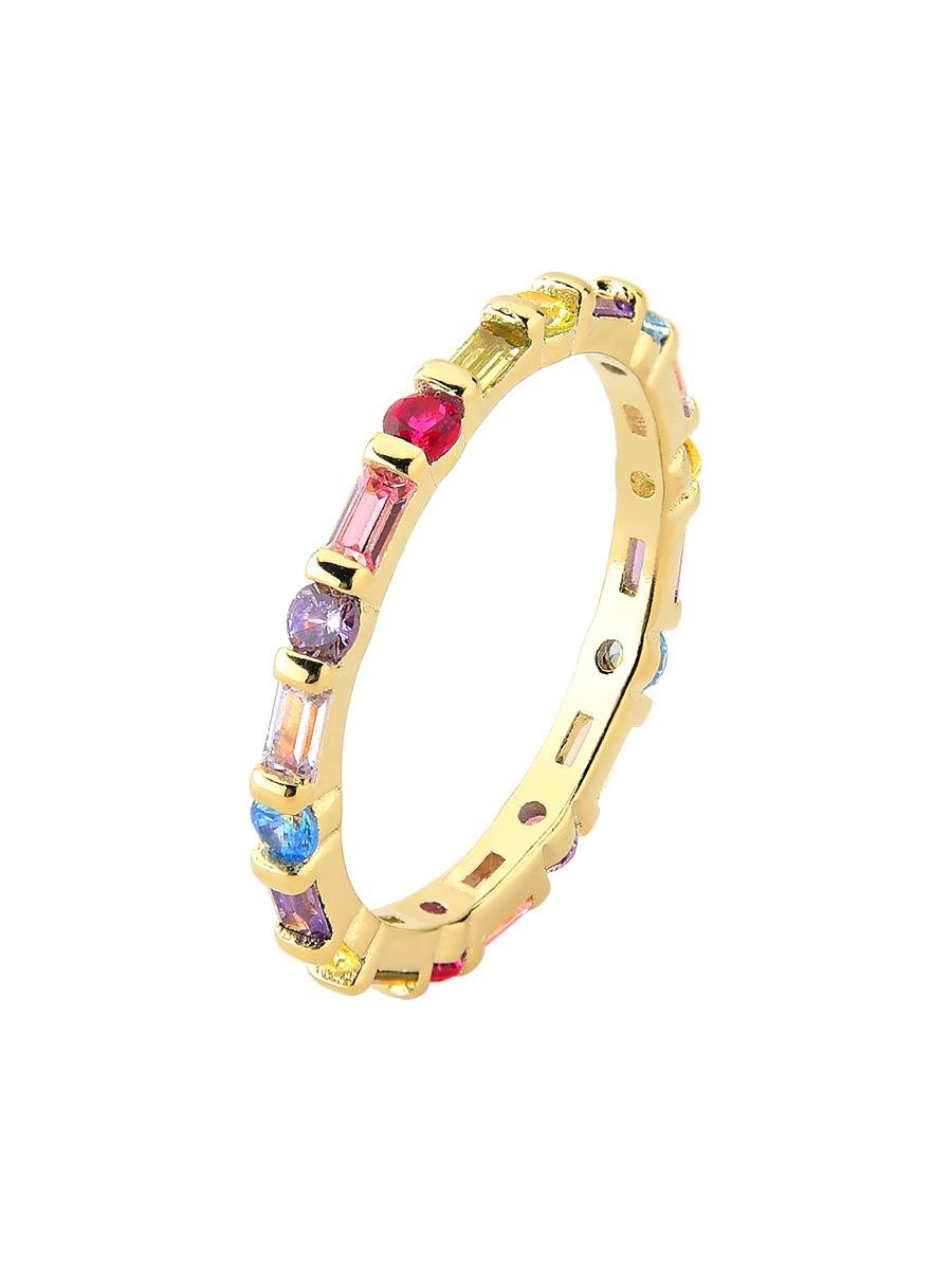 Anel cravejado com zircônias redondas e baguetes coloridas, banho de ouro 18k.| Tamanhos | |||||