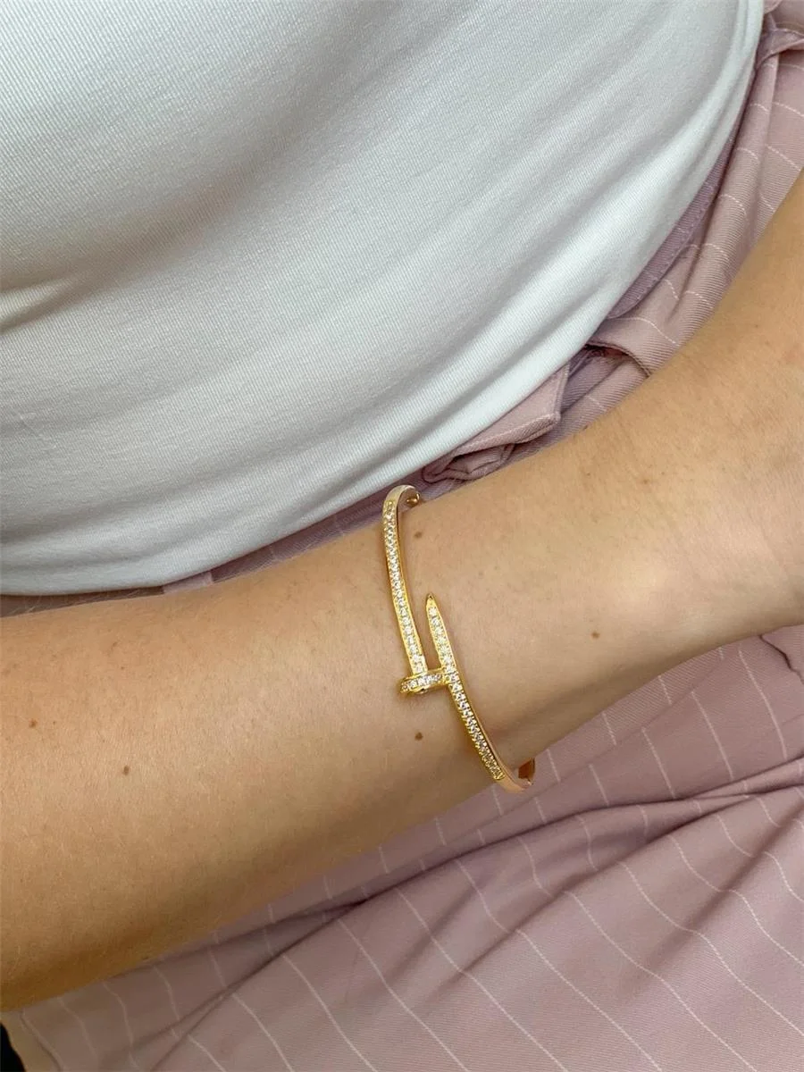 Bracelete Prego Cravejado Banhado a Ouro 18K.As semijoias com design de trevo trazem a combinação perfeita entre elegância e modernidade. Inspiradas na forma do trevo, símbolo clássico de sorte e boas energias, essas semijoias são delicadamente confeccionadas e banhadas em ouro ou ródio, garantindo brilho duradouro e sofisticação. Ideais para quem busca um toque de estilo único, essas semijoias vão trazer para o seu mostruário um visual refinado e cheio de significado. Seu design versátil combina facilmente com outros acessórios, permitindo composições harmoniosas e elegantes.