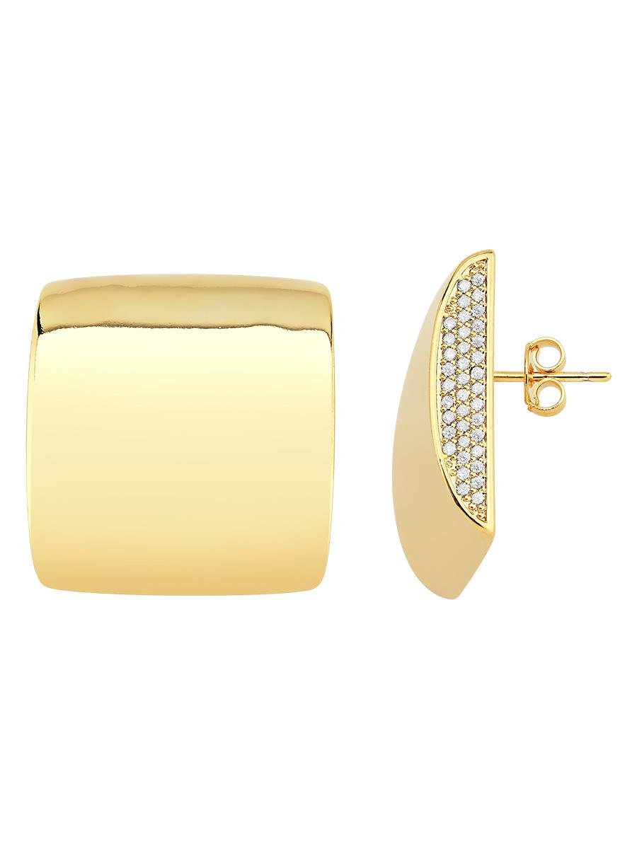 Brinco quadrado liso e cravejado na lateral com zircônias incolores com detalhes vazados na parte de trás, no banho de ouro 18k.| Altura | 2.4 cm |