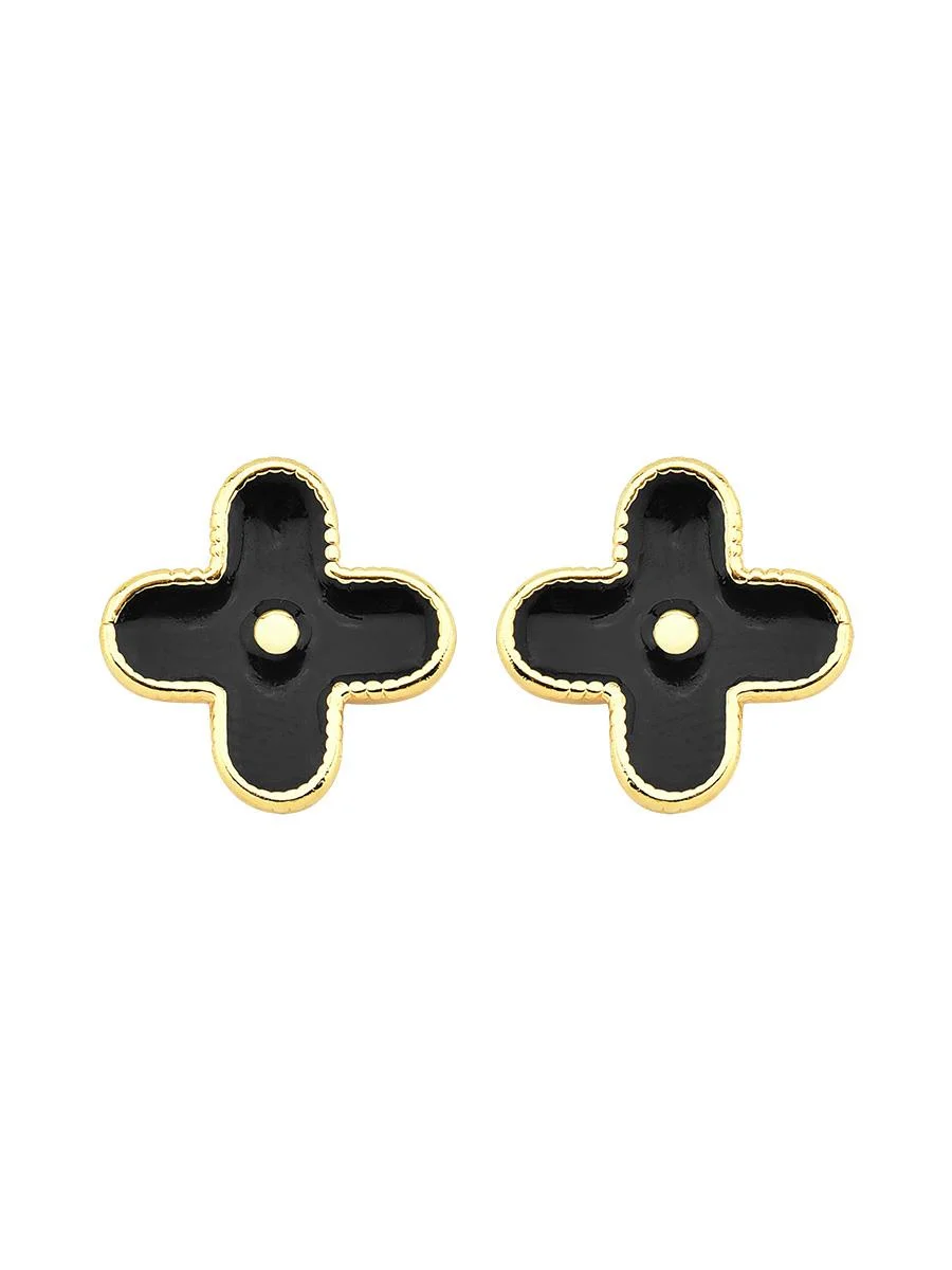 Brinco em formato trevo na resina preta, no banho de ouro 18k.| Altura | 1 cm |