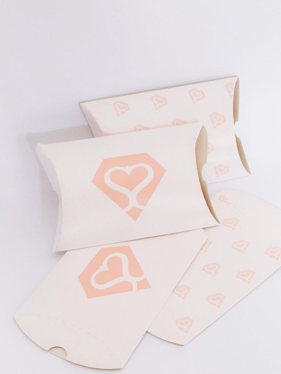 Caixa dobrável modelo almofada, na cor salmão com logo (Raríssima Joias )