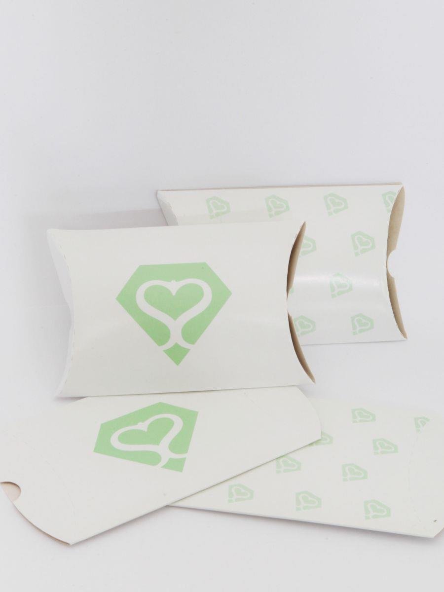 Caixa dobrável modelo almofada, na cor verde, com logo (Raríssima Joias )