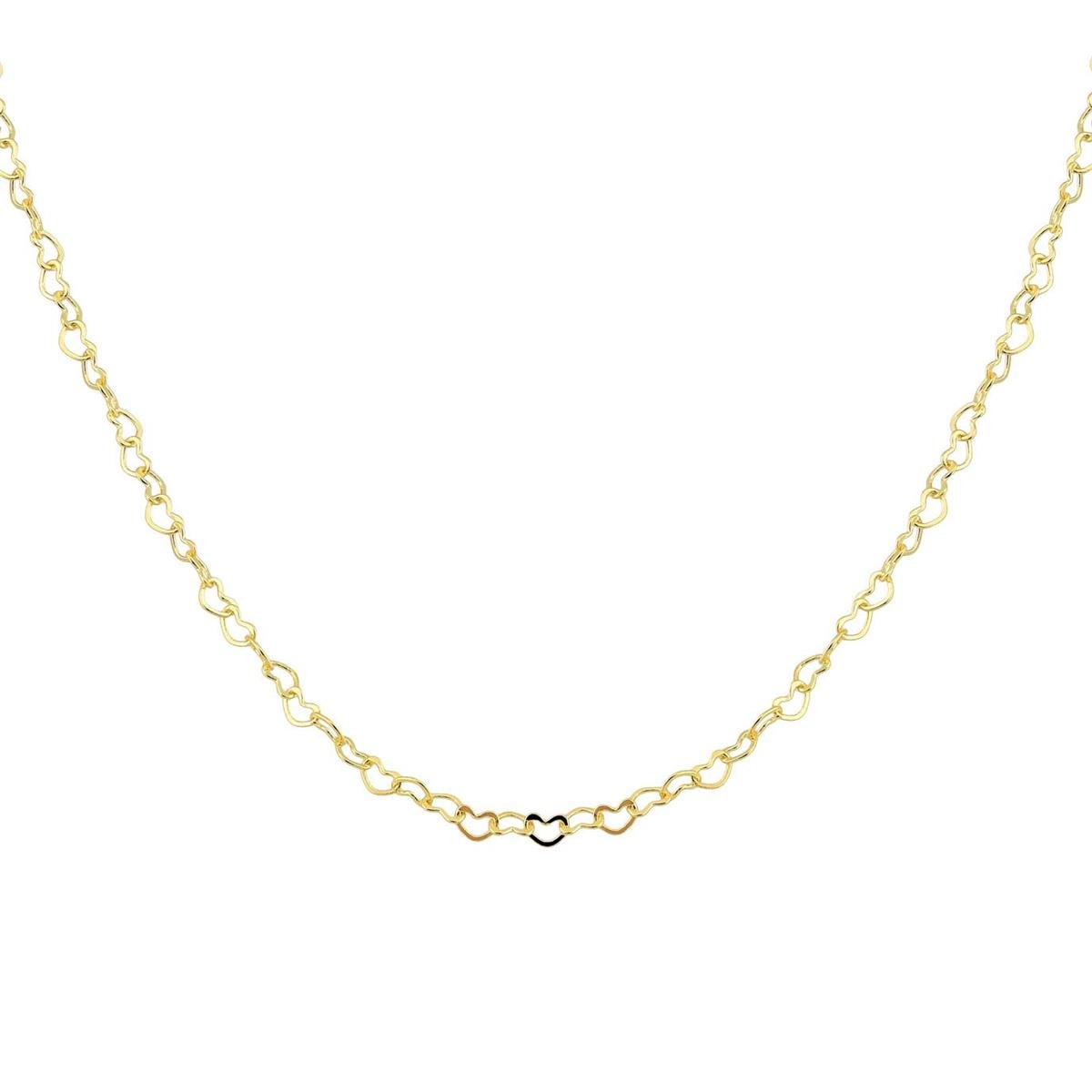 Colar choker composto por elos em formato de corações, banhado a ouro 18k.As correntarias são a base de qualquer coleção de semijoias, oferecendo uma infinidade de possibilidades para compor e realçar diferentes looks. Nossa linha de correntes inclui desde o clássico cordão baiano até malhas, fitas, sendo cada peça pensada para trazer estilo e sofisticação ao seu mostruário. Feitas com materiais de alta qualidade e acabamentos perfeitos, essas correntes são versáteis, podendo ser usadas sozinhas ou combinadas com pingentes e outras semi joias, criando composições únicas para suas clientes.