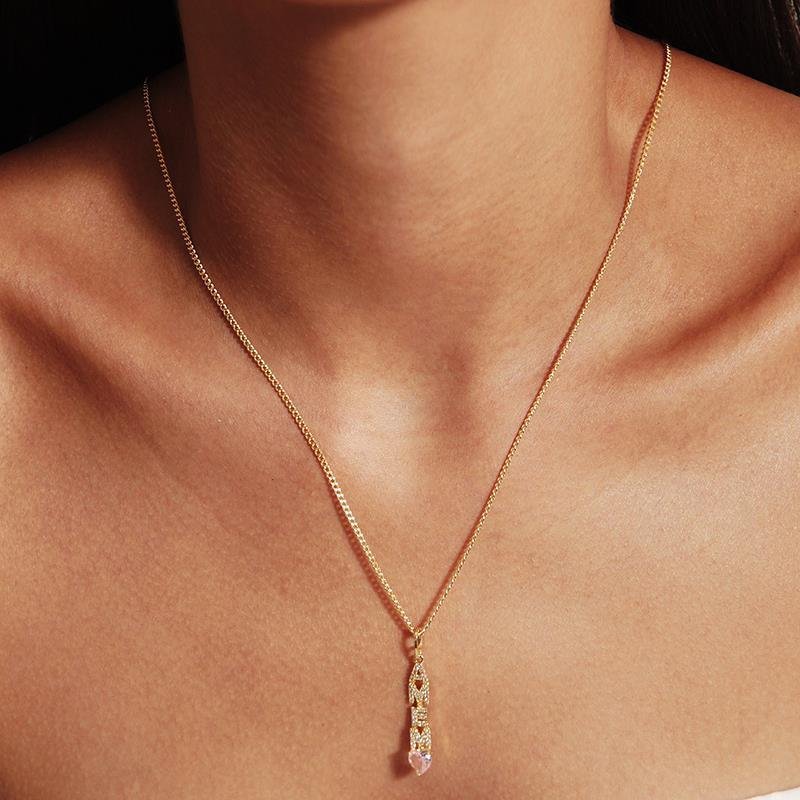 Colar com corrente grumet e pingente com a palavra "Amém" cravejado com micro zircônias incolores e detalhe de cristal kunzita em formato de coração, banho de ouro 18K.