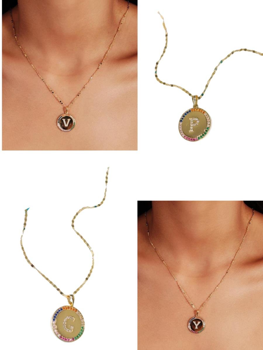 Colar com corrente piastrini e pingente de inicial com detalhe colorido, folheado a ouro 18K.