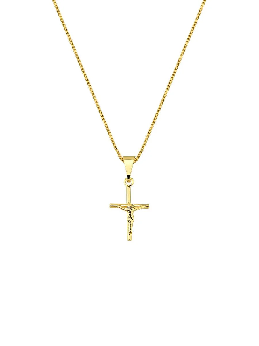 - Colar modelo masculino composto por corrente veneziana grossa e pingente de crucifixo pequeno.- Banho de ouro 18k.