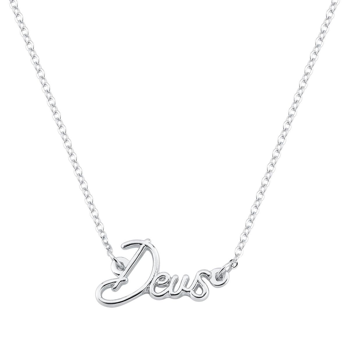 Colar com corrente de mini elos e pingente da palavra " Deus", banhado em ródio branco.