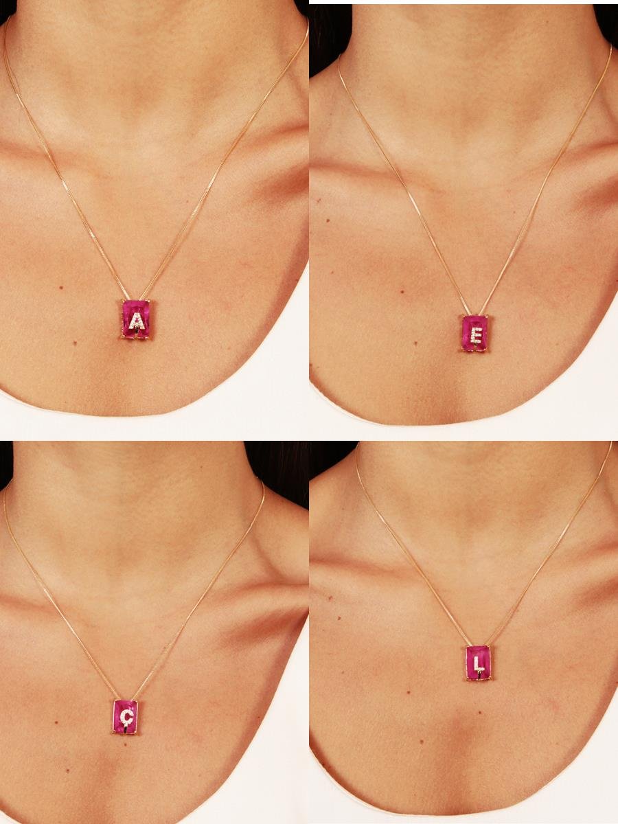 - Colar com corrente veneziana e pingente com a letra cravejado de micro zircônia incolor e pedra cristal fuzion da cor pink.- Banho de ouro 18K.