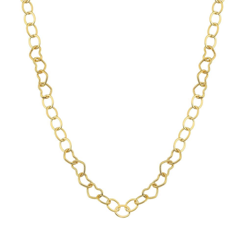 Colar composto por elos ovais e corações vazados, banho de ouro 18K.