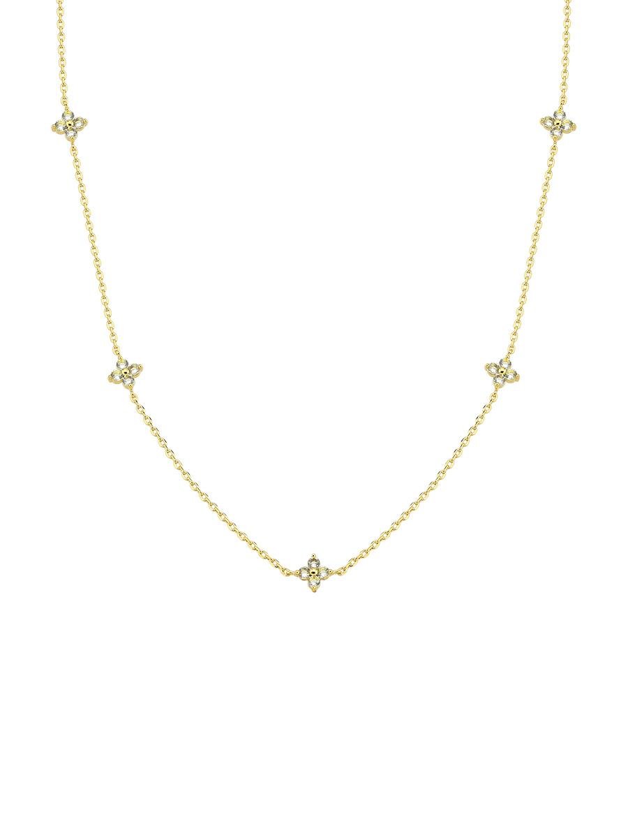 Colar composto por mini elos com detalhes de flores em micro zircônia áqua, banho de ouro 18k.| Tamanhos | |