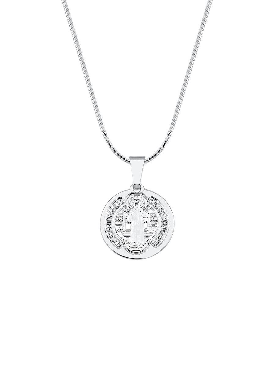 Colar na corrente rabo de rato com pingente medalha de são bento liso, no banho de ródio branco.| Comprimento | 45 cm |