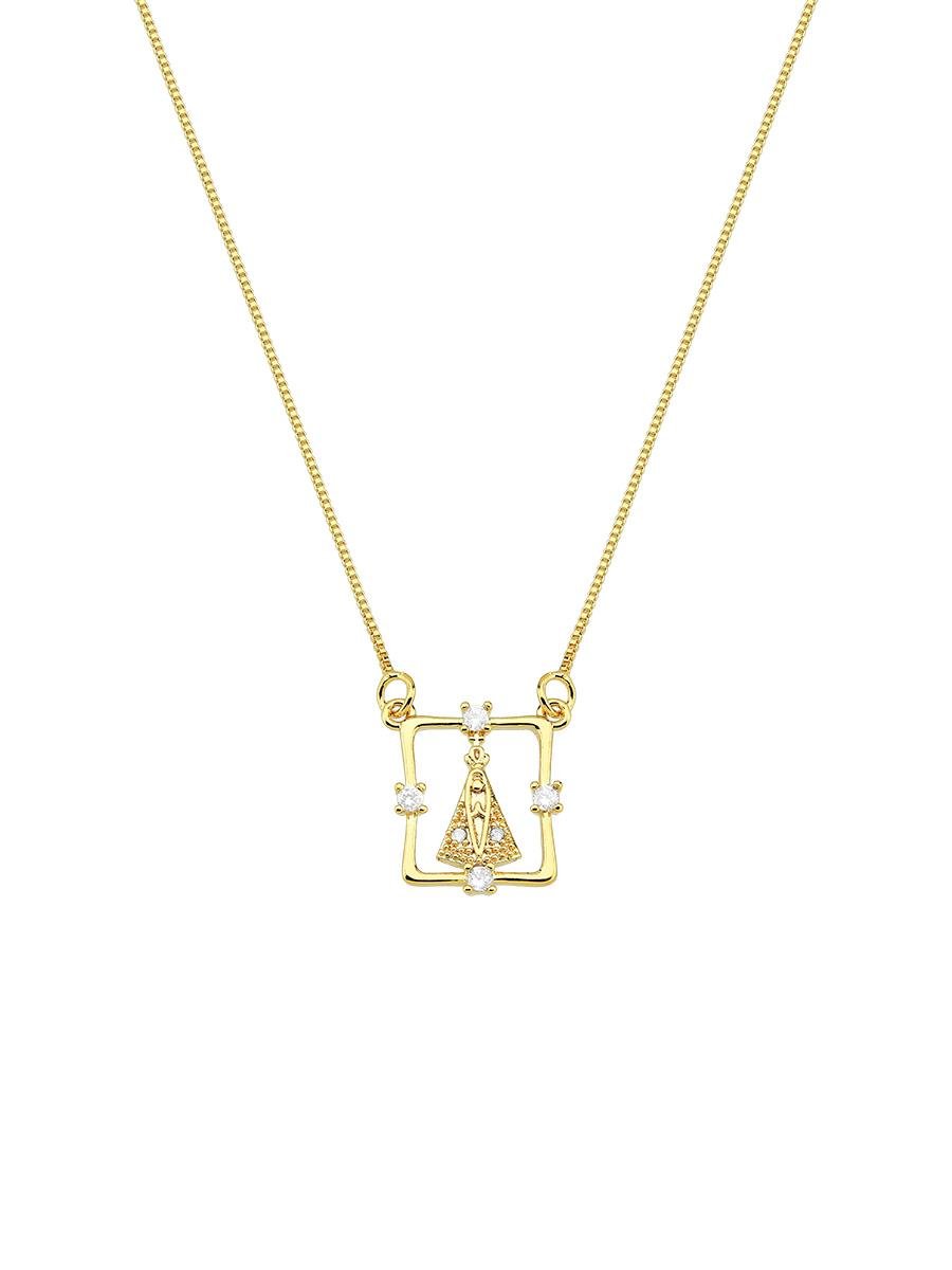 Colar com corrente veneziana e pingente de Nossa Senhora Aparecida vazado, cravejada com micro zircônias incolores, no banho de ouro 18K.| Comprimento | 45 cm aberta (mais 5 cm de extensor) |