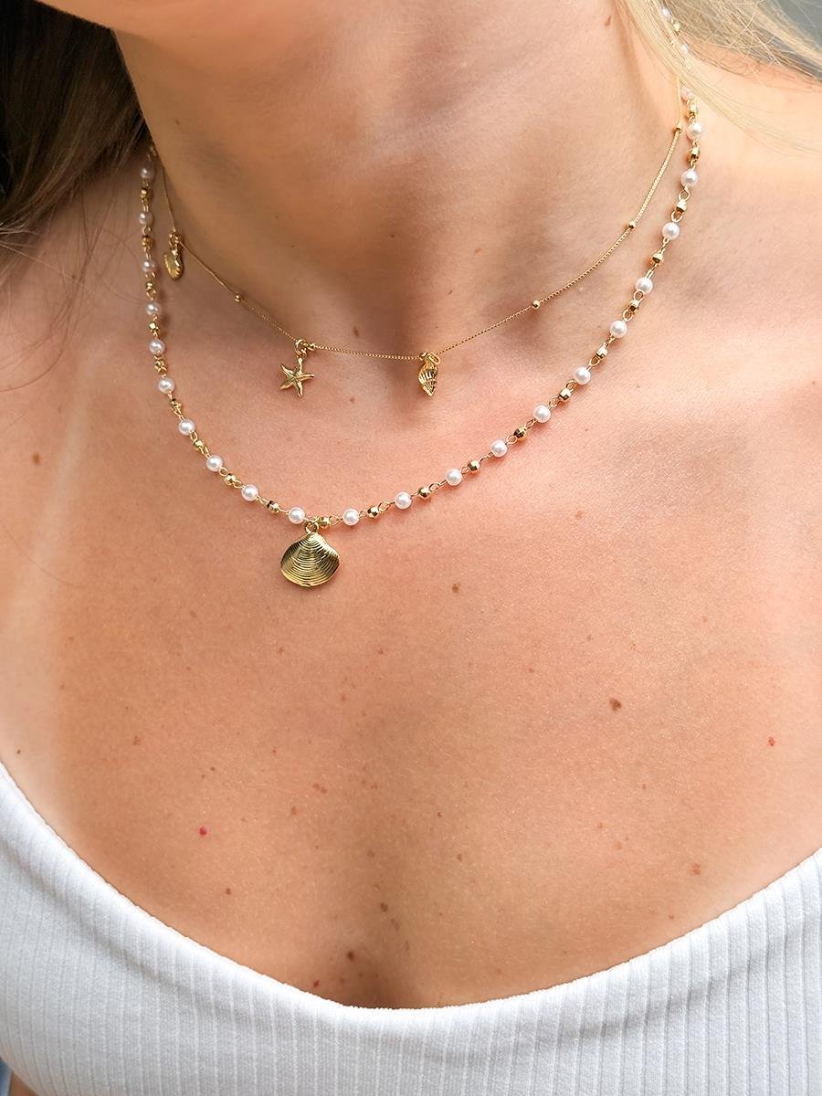 Colar Pérola e Globo com Concha Banhado a Ouro 18K.A cápsula Summer Part II é inspirada no mar, na brisa da praia e na beleza natural das pérolas. A coleção reúne peças leves, femininas e atuais, pensadas para o clima do verão. Com um design versátil e atemporal, as semijoias acompanham diferentes momentos do dia, do look casual ao mais arrumado, sempre com um toque de leveza e estilo. São peças que combinam com o verão, mas continuam fazendo sentido em qualquer estação.