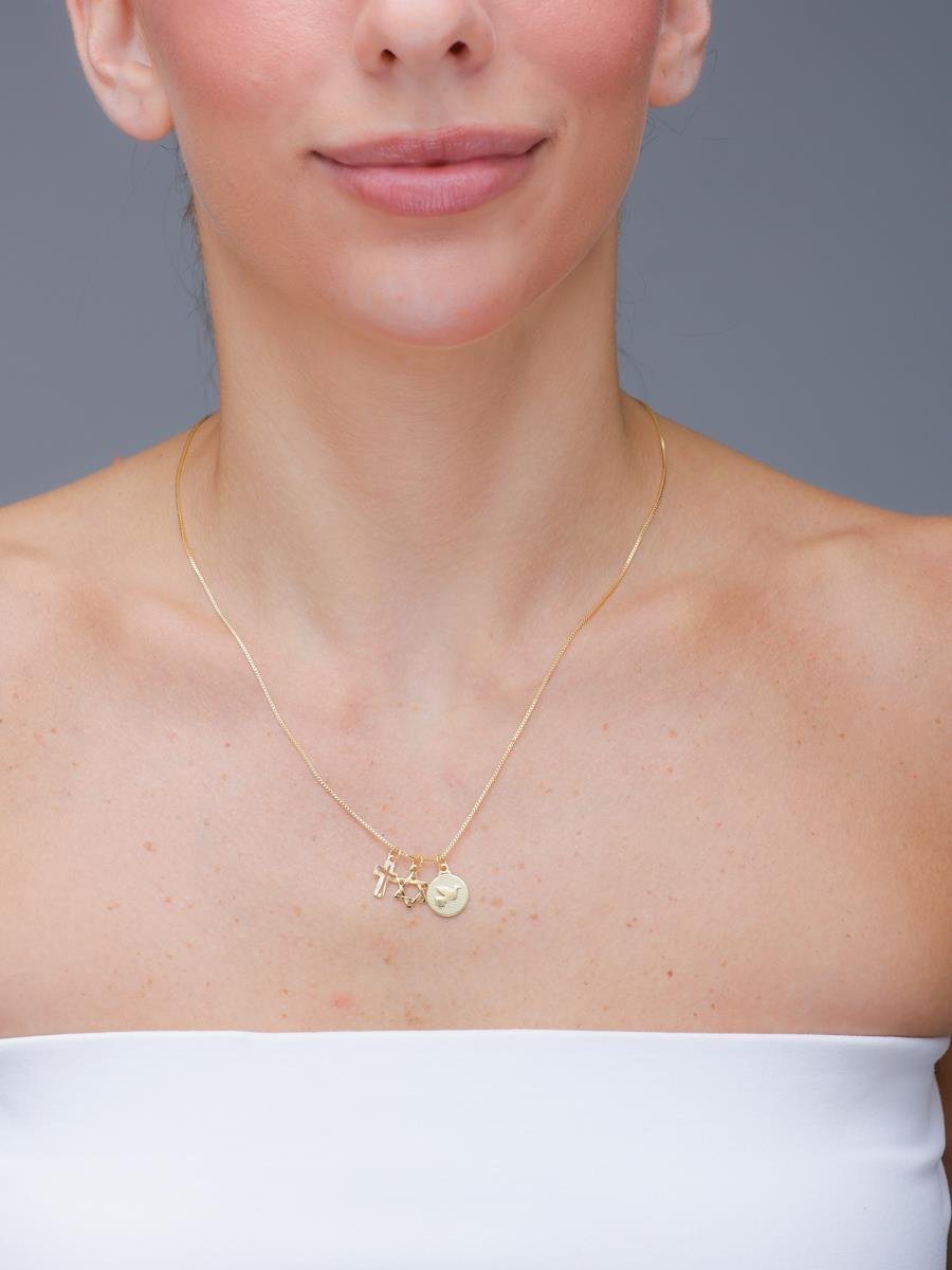 Colar Plaquinha Espírito Santo Cruz e Estrela de Davi Banhado a Ouro 18k.As Novidades de Fevereiro foram pensadas para quem deseja revender semijoias com mais facilidade e montar uma maleta moderna e versátil. Inspirada no conceito de duas peças na mesma cartela, essa coleção reúne semijoias minimalistas e atemporais, com modelos que incluem pérolas, colares, mistura de banhos, argolas e braceletes, ideais para atender diferentes estilos de clientes.