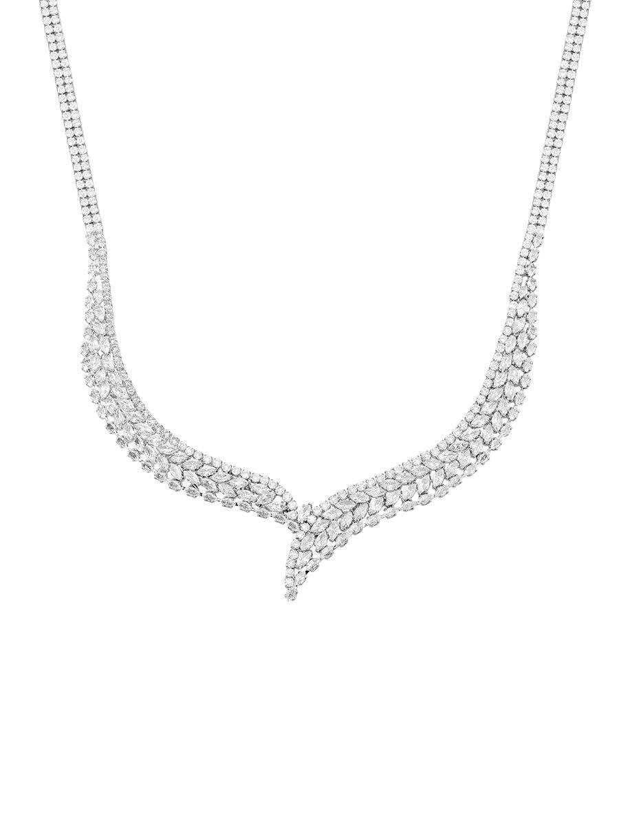 Colar em detalhe V cravejado com zircônias navetes incolor e micro zircônias incolores, banho de ródio branco.| Comprimento | 42 cm |