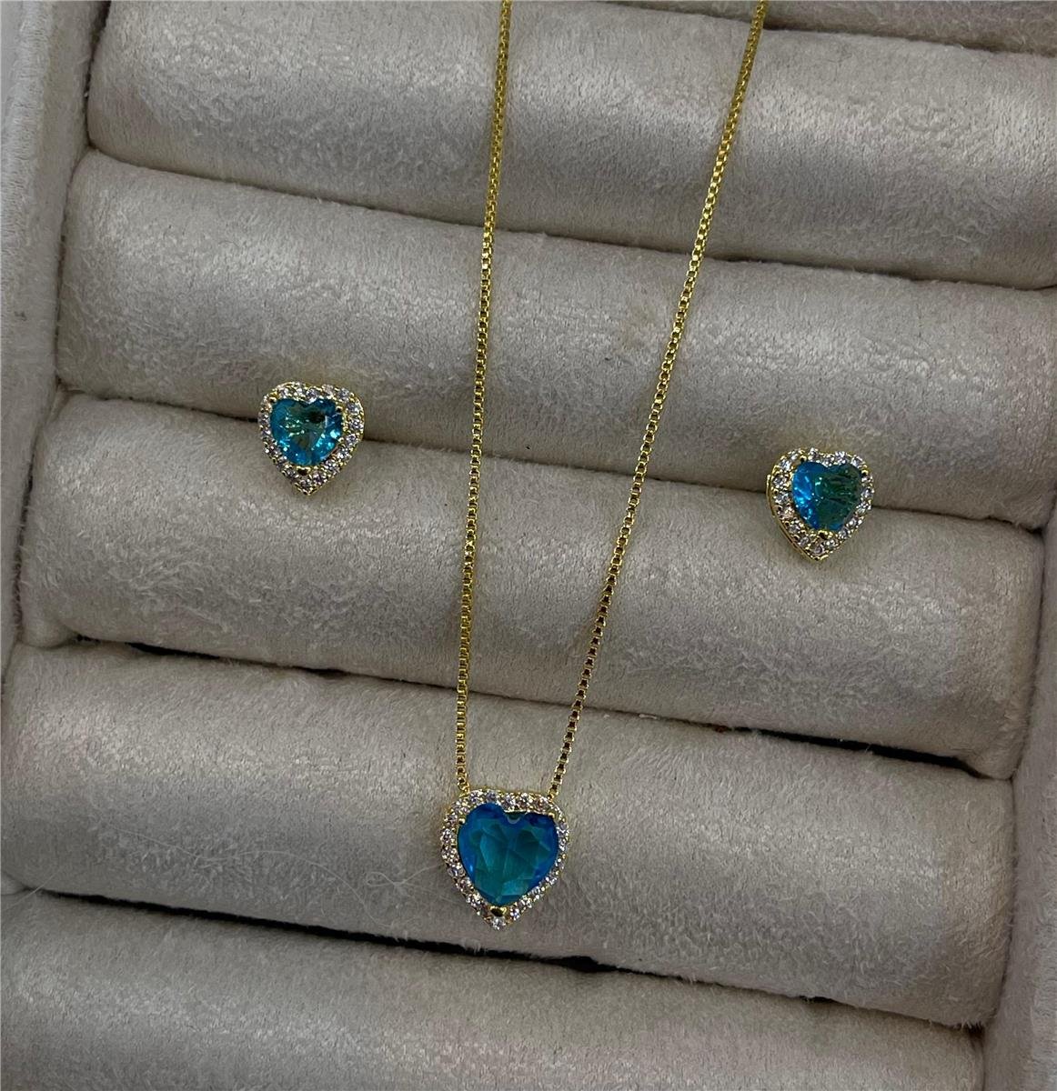 Conjunto Coração Áqua Banhado a Ouro 18k.Semijoias cravejadas são sinônimo de luxo e delicadeza, trazendo um toque de sofisticação para qualquer mostruário. Com pedras minuciosamente cravejadas, elas oferecem um brilho único, refletindo sofisticação e exclusividade. Semijoias cravejadas são verdadeiros ícones no mundo da moda, sendo tendência constante entre os acessórios mais desejados. Além da beleza visual, nossas peças cravejadas são produzidas com materiais de alta durabilidade, garantindo que cada detalhe mantenha seu brilho e acabamento impecável por muito mais tempo.