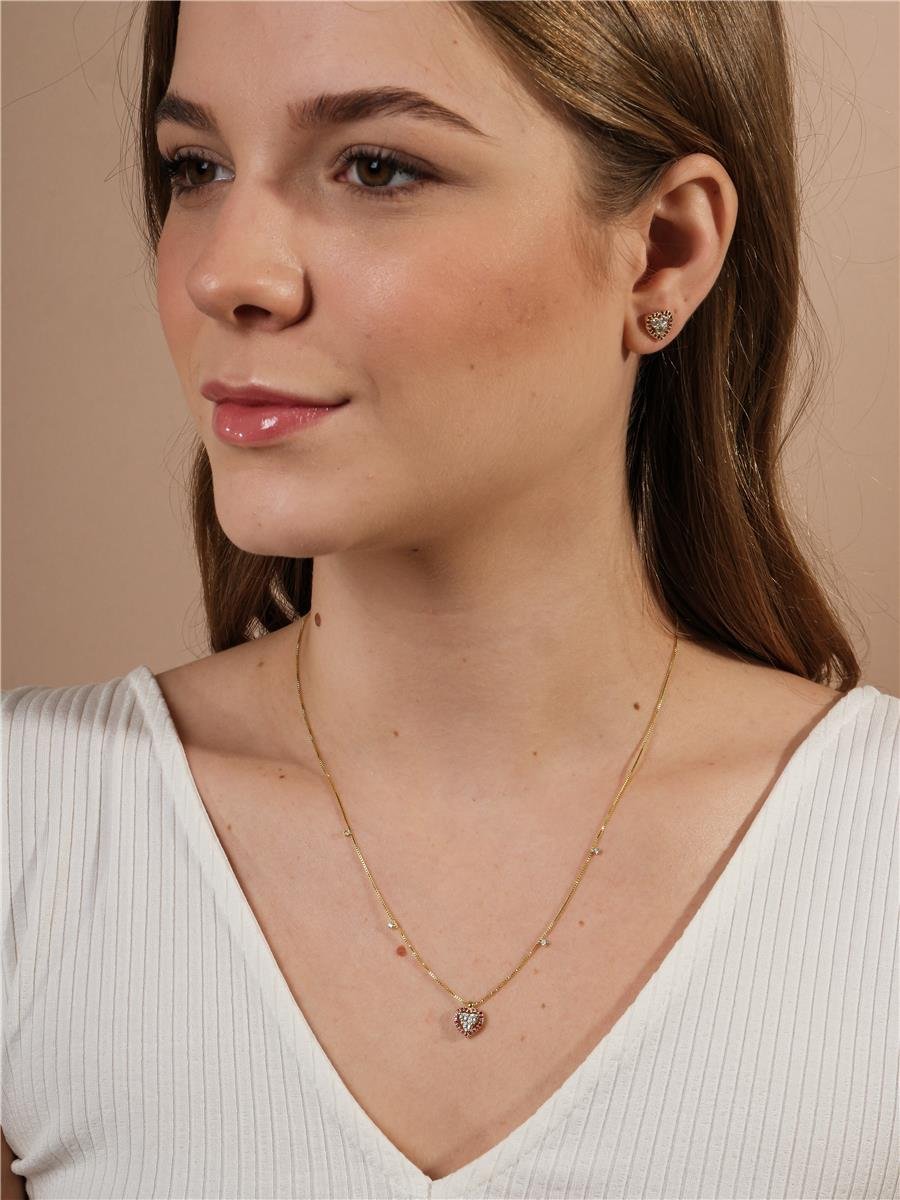- Conjunto de colar em corrente veneziana com zircônias incolores e pingente em coração cravejado de micro zircônia rubi, brincos em forma de coração cravejado em micro zircônia rubi.- Banho de ouro 18K.