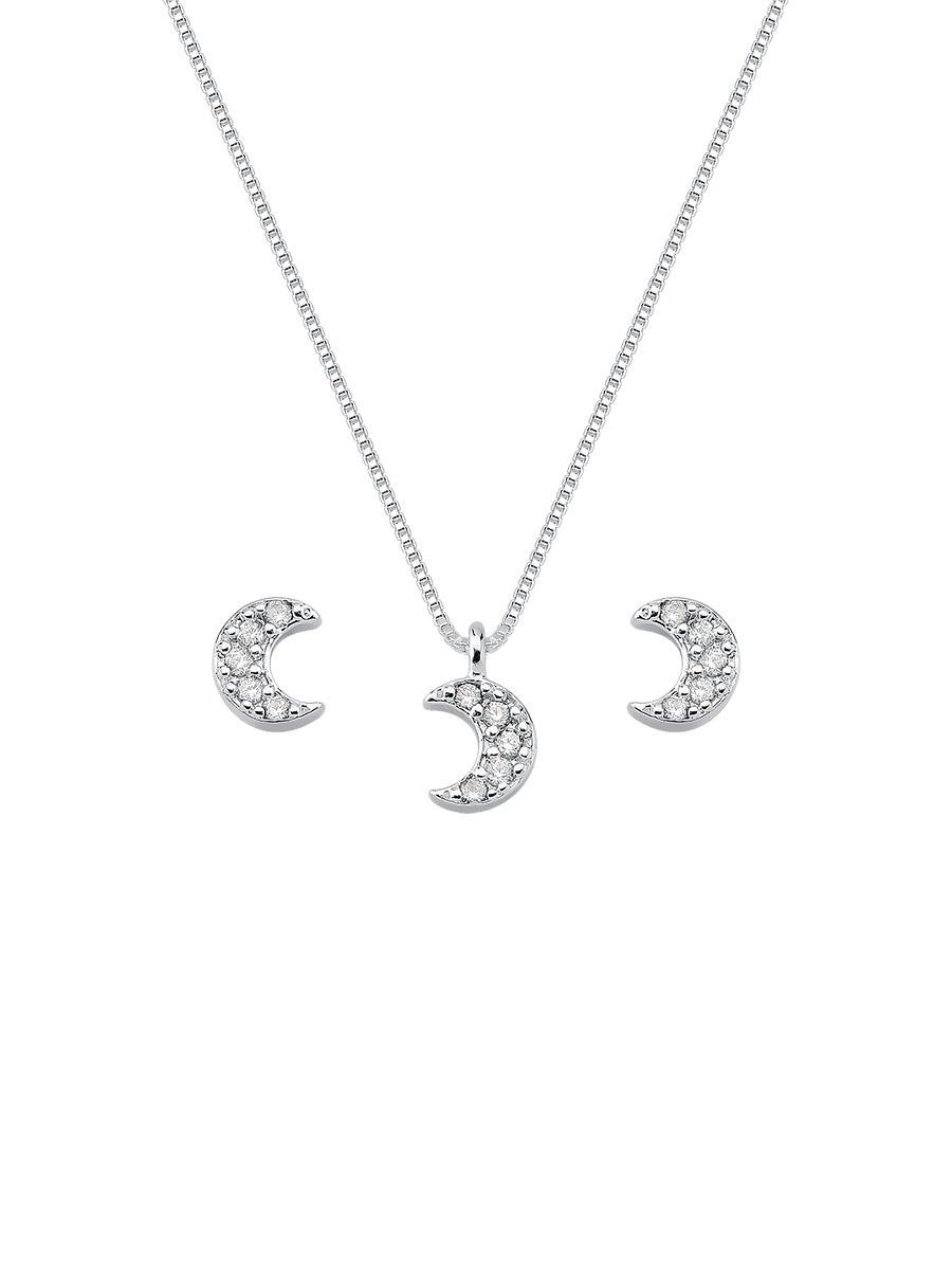 Conjunto de veneziana com brincos e pingente de lua cravejada com zircônias incolor, banho de prata.| Comprimento | 40 cm (mais 5 cm de extensor) |