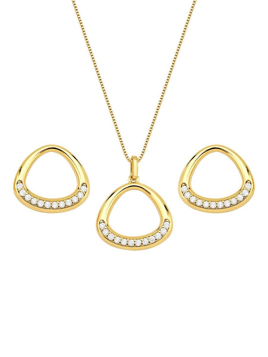 Conjunto Triângulo Cravejado Banhado a Ouro 18K.Esta semijoia é a fusão perfeita entre o design clean da parte lisa e o brilho sofisticado da parte cravejada. A combinação dessas texturas cria um visual moderno e sofisticado, ideal para quem procura um toque de elegância sem perder a versatilidade. A parte cravejada, com seu brilho sutil, confere à peça um ar de exclusividade, enquanto a parte lisa mantém a sobriedade necessária para equilibrar o conjunto. Perfeita para ocasiões especiais ou para complementar o look do dia a dia, essa peça é ideal para revenda, conquistando clientes que buscam por um acessório que combine qualidade, estilo e sofisticação. É uma escolha certa para enriquecer o mostruário, atendendo a diferentes preferências e garantindo sucesso em qualquer coleção.