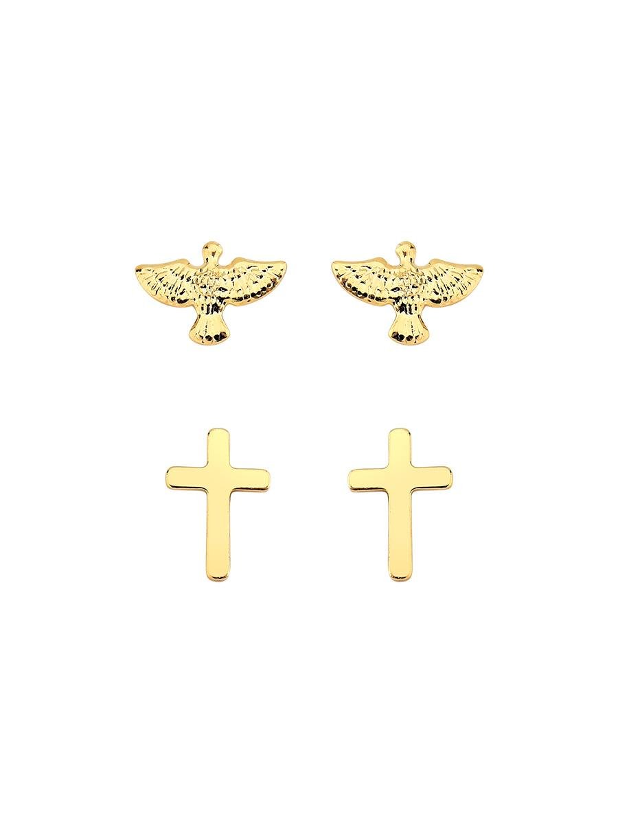 Dupla de brincos composto por um brinco de cruz lisa e outro de Espírito Santo, banho de ouro 18k.| G | M | |