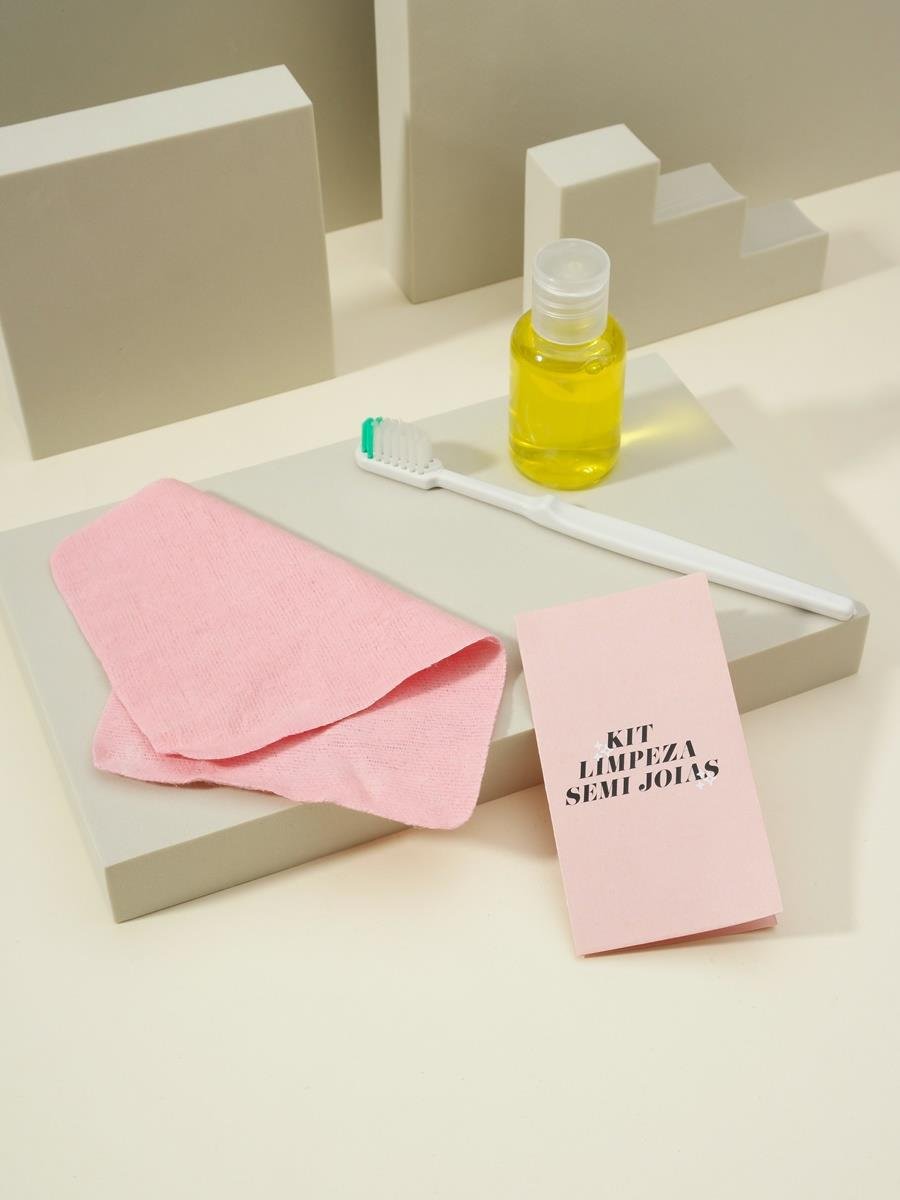 Kit para limpeza de semijoias, contendo: Um frasco com detergente neutro, uma escova com cerdas macias e uma flanela mágica.