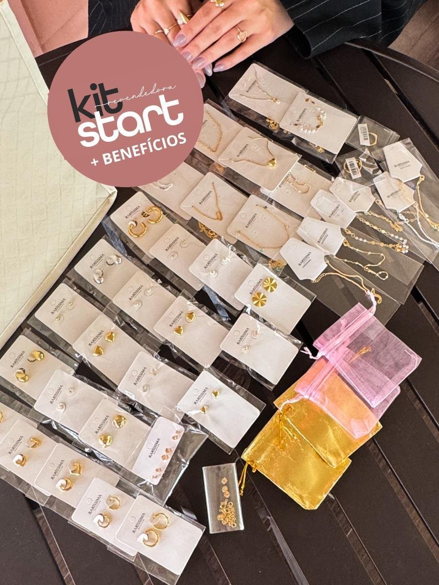O Kit Start é o ponto de partida ideal para quem quer empreender com segurança e começar a lucrar desde já. Dê o primeiro passo no seu negócio e descubra o potencial de transformar semijoias em renda real!